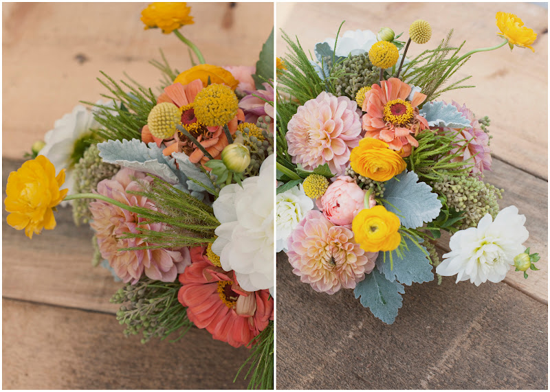 this guy has got summer written all over it... bright yellow ranunculus and billy balls, mixed with peachy zinnias and dahlias...ummm, so good you could eat it.